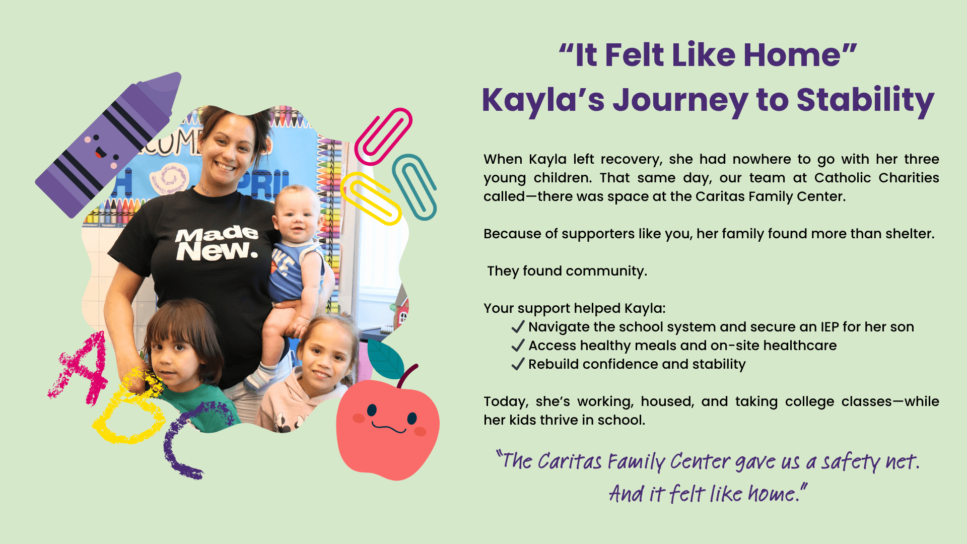 — Kayla, former Caritas Family Center client