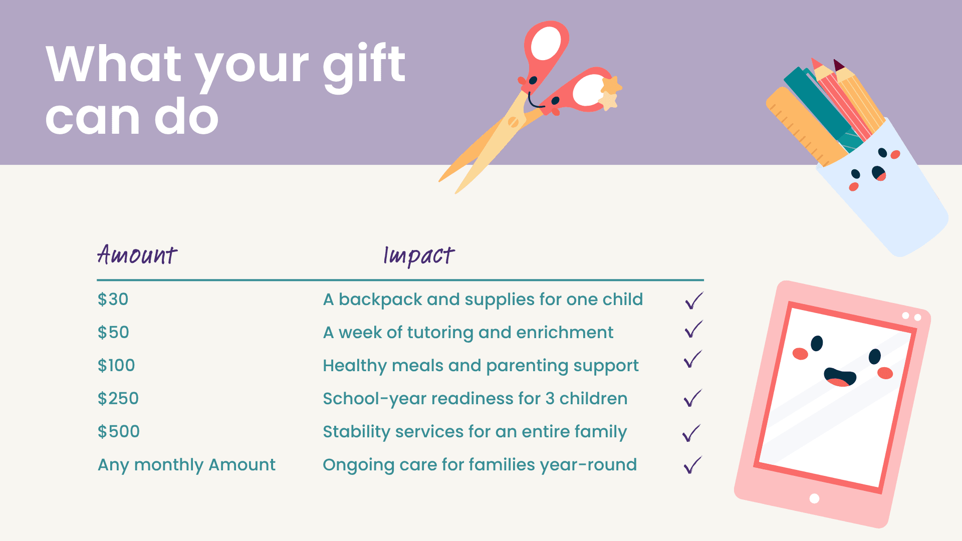 You provide the backpacks, the fresh haircuts, the excitement of a new school year. You create the joy, the memories, the sense of normalcy every child deserves.